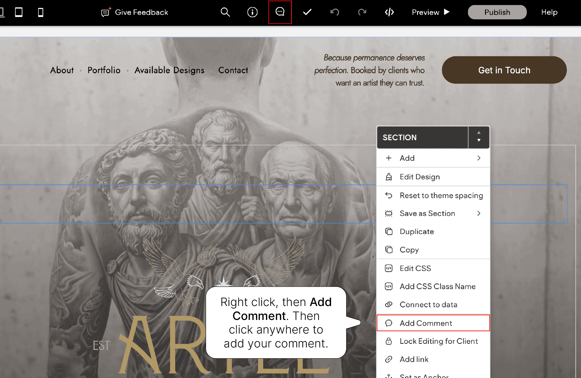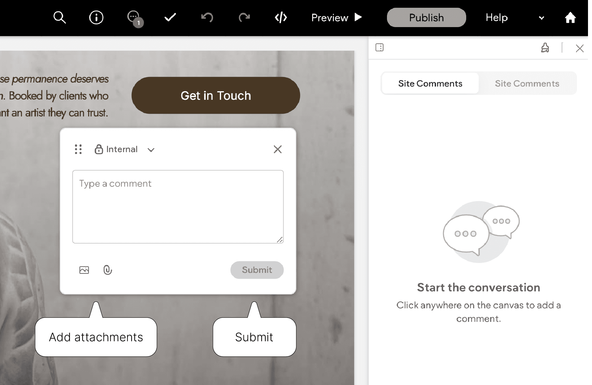 Click the Comments icon at the top of your site preview